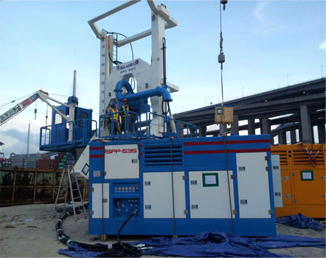 講座最后,景安重工董事長(zhǎng)陳衛(wèi)先生對(duì)景安JRD(氣舉反循環(huán))鉆機(jī)及其聯(lián)合全回轉(zhuǎn)施工工藝進(jìn)行了詳細(xì)介紹與講解。他指出,JRD反循環(huán)鉆機(jī)是一套以全液壓控制的嵌巖鉆機(jī),利用液壓旋轉(zhuǎn)動(dòng)力頭提供足夠的扭矩及旋轉(zhuǎn)速度,再加上鉆具自重及加壓液壓油缸的下壓力,通過(guò)鉆頭上滾刀對(duì)巖面進(jìn)行位移與壓破,從而達(dá)到嵌巖的效果。該鉆機(jī)及相關(guān)工法已在福建、香港、澳門等地區(qū)的重點(diǎn)工程中“大顯身手”,為復(fù)雜地層的嵌巖施工提供了極佳的方案,獲得合作方一致好評(píng)。