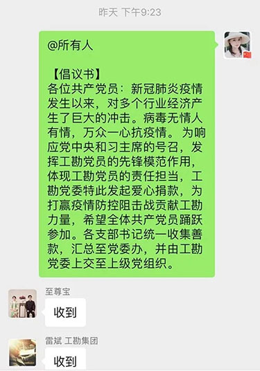 倡議一經(jīng)發(fā)出,工勘集團(tuán)黨委委員及各支部書記第一時間發(fā)揮“頭雁”作用,帶頭捐款,廣大黨員積極響應(yīng),入黨積極分子和群眾也紛紛表示要向黨員學(xué)習(xí),為防疫工作貢獻(xiàn)出自己的一份力量。眾志成城齊戰(zhàn)“疫”,短短兩個小時,集團(tuán)黨委就收集到愛心捐款38700元,用涓涓細(xì)流匯聚成齊心戰(zhàn)“疫”的愛心暖流。