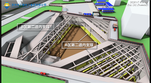 運(yùn)用BIM模型模擬土石方開(kāi)挖,明確土方開(kāi)挖順序以及開(kāi)挖過(guò)程中的出土方向。白鵝潭國(guó)際金融中心項(xiàng)目土方豎向開(kāi)挖依據(jù)支撐標(biāo)高分為4個(gè)施工層段,均由基坑非支撐影響區(qū)中心在原開(kāi)挖面采用后退式開(kāi)挖。